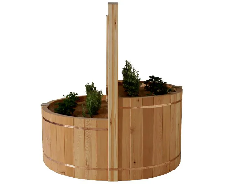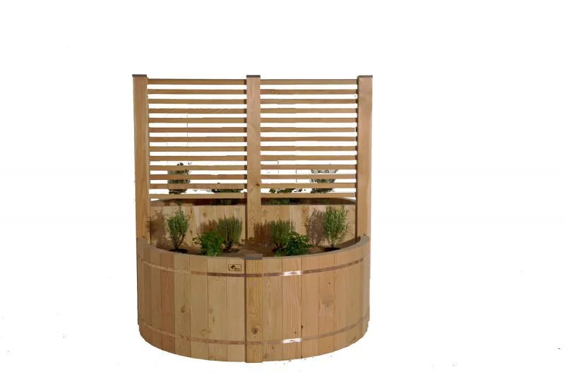 | Technische Daten: | DM 152 cm, Höhe 80 / 60 cm, mit Rankgitter Höhe 166 cm, Wandstärke ca. 5,6 cm, , Steher 9 x 9 cm |